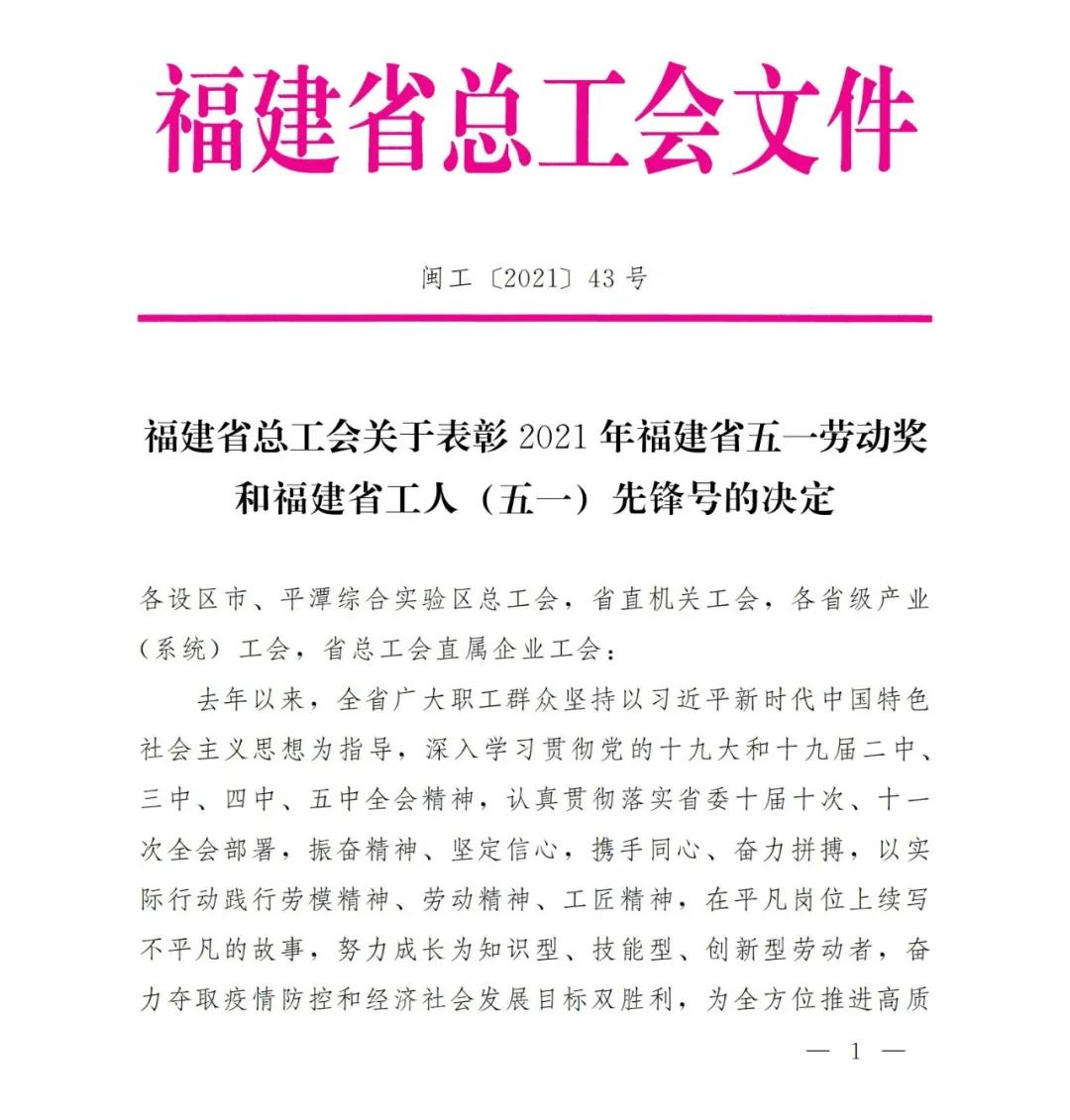 近日,省總工會通報表彰了2021年福建省五一勞動獎和福建省工人 (五一) 先鋒號,福建省水利投資開發(fā)集團有限公司榮獲福建省五一勞動獎狀。